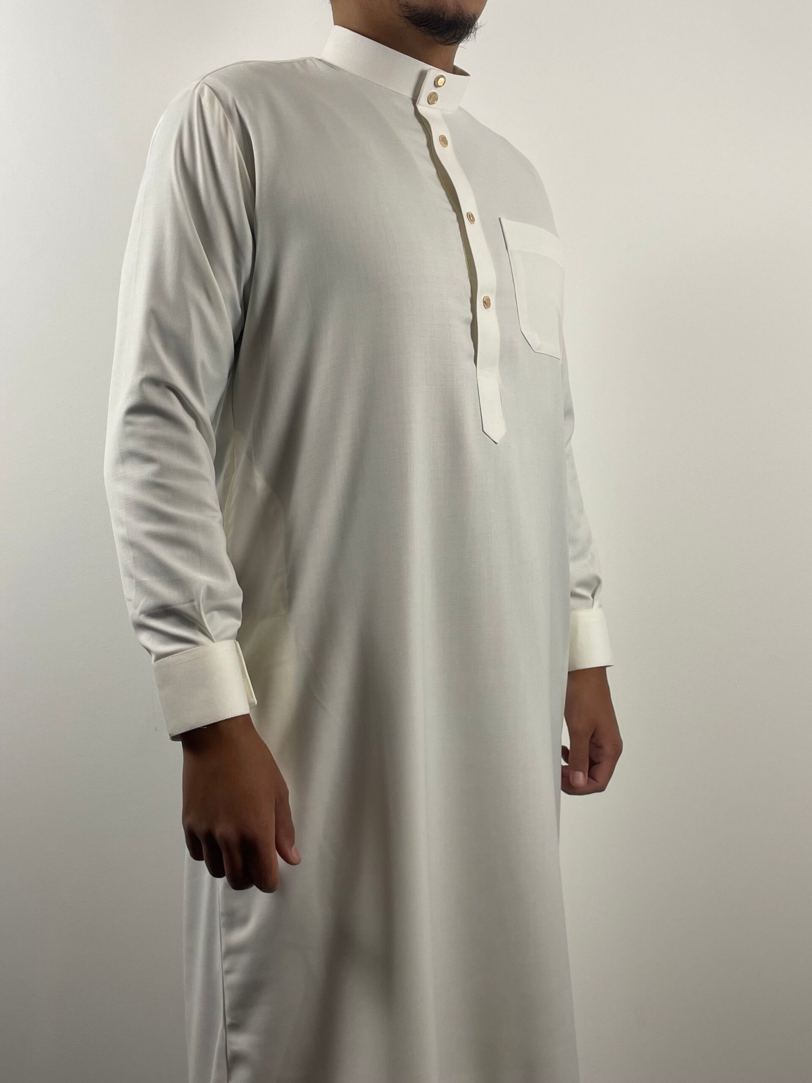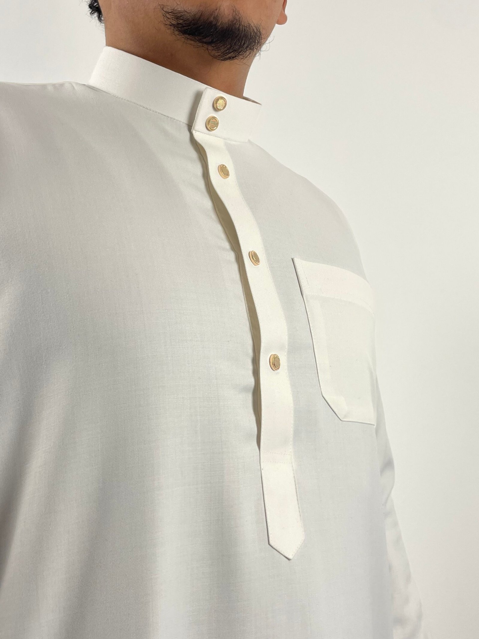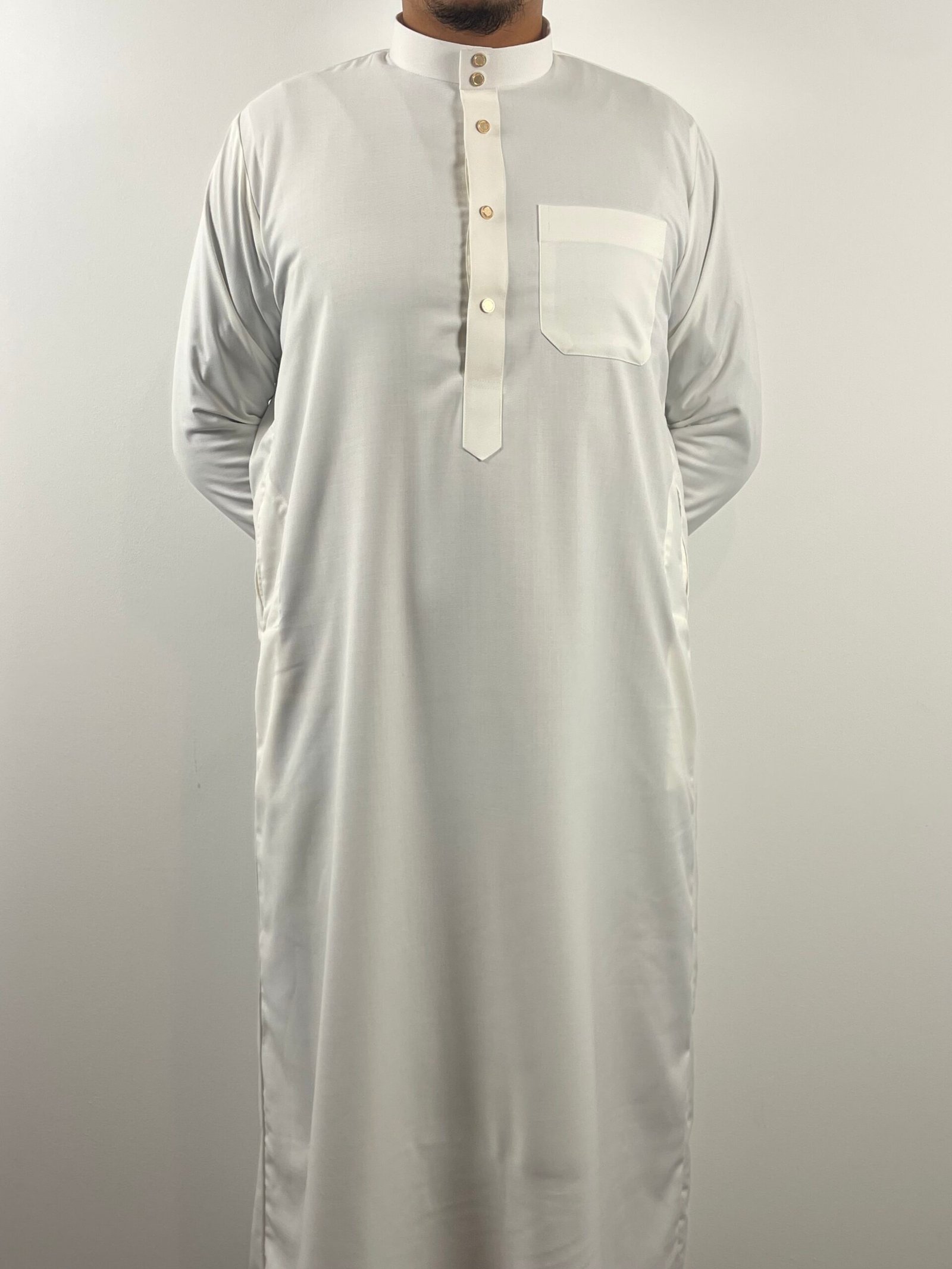 Qamis au col rond épuré, sublimé par un bouton doré discret qui apporte une touche élégante sans en faire trop. Coupe droite et fluide pour un tombé naturel et confortable. Les manches sont dotées de boutons assortis, ajoutant une finition soignée et raffinée. Un modèle simple mais distingué, idéal au quotidien comme pour les occasions.