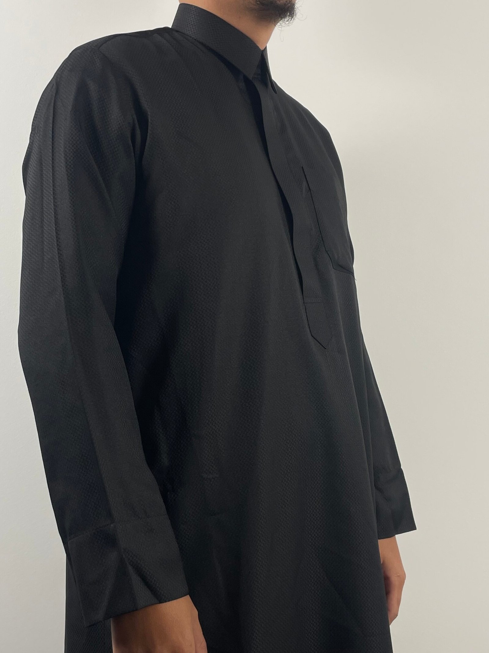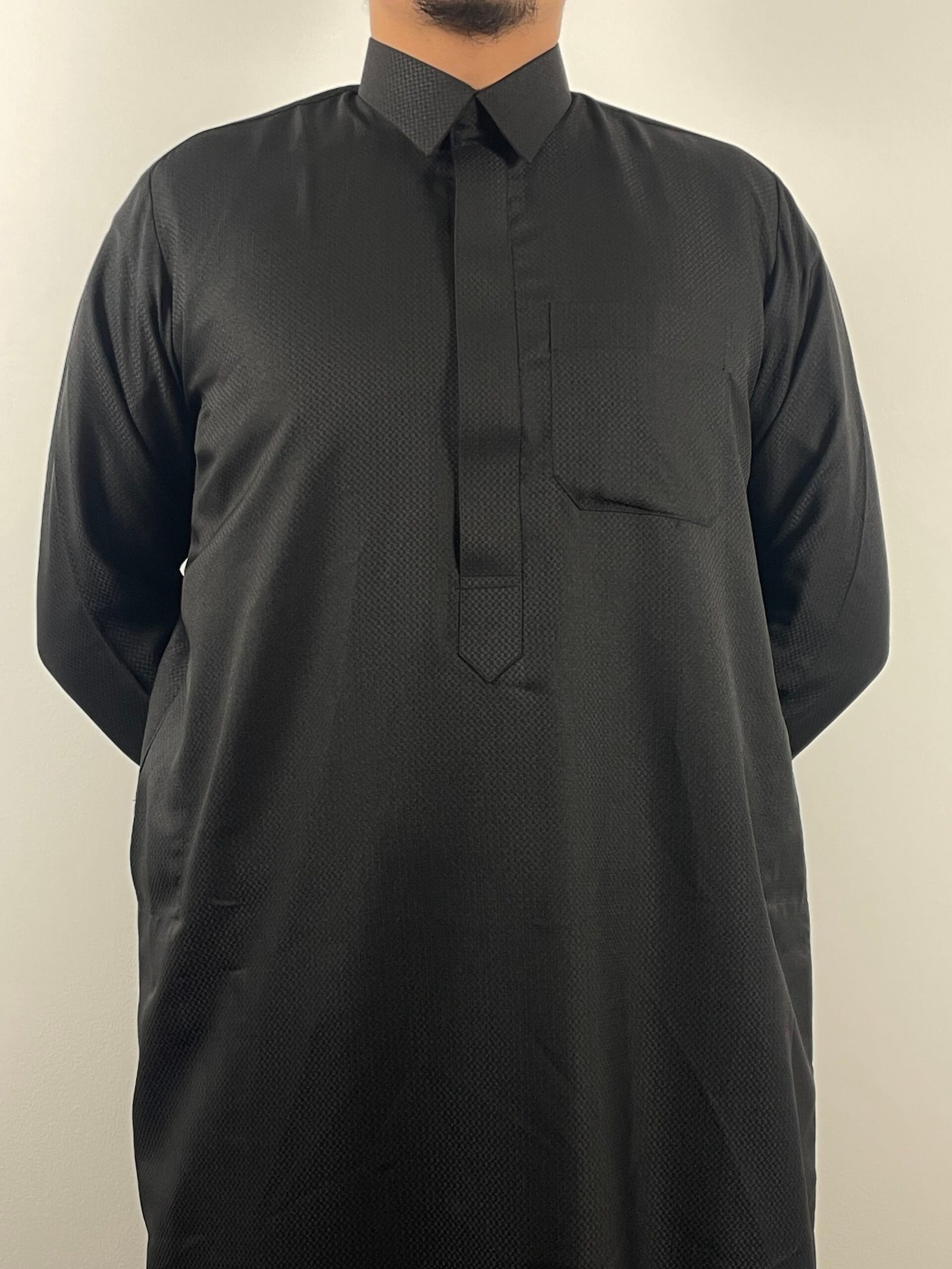 Un qamis haut de gamme au design raffiné, sublimé par de subtils motifs damiers qui apportent caractère et distinction sans compromettre la sobriété. Sa coupe structurée et son tissu premium offrent un tombé impeccable et un confort optimal.